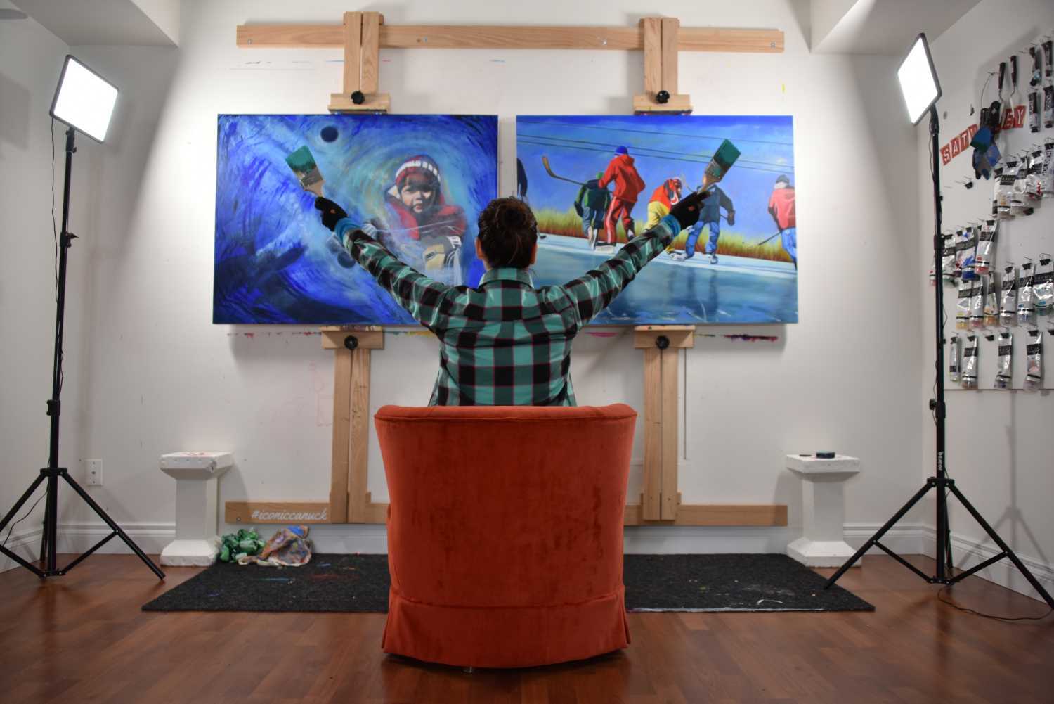 The landscape is never a backdrop for me. It is an active presence. Canada’s geography, weather, and vastness shape how we move through the world, and I try to reflect that lived experience in my paintings. The figures don’t dominate the land or pose within it. They stand in relation to it, sometimes dwarfed by scale, sometimes absorbed into it, always responding to place.