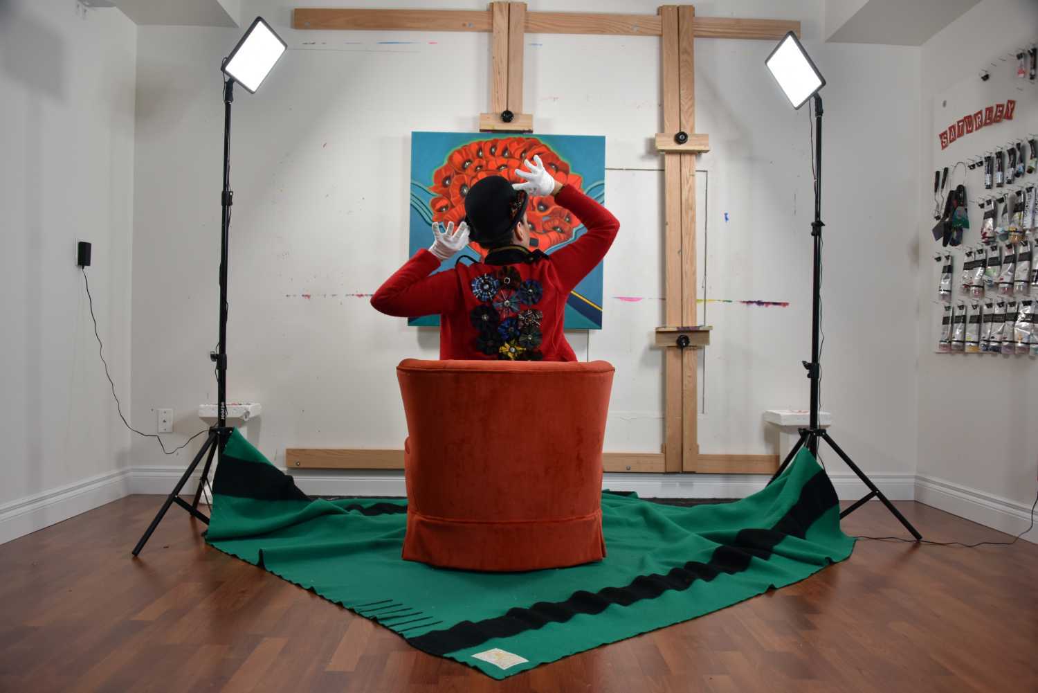 The idea of the Rückenfigur doesn’t only appear in my finished paintings. It has quietly become part of my studio practice as well. At the end of nearly every painting, I take a moment to sit with the work. I place my orange velour retro chair a short distance from the canvas and sit facing it, allowing the painting to look back at me.