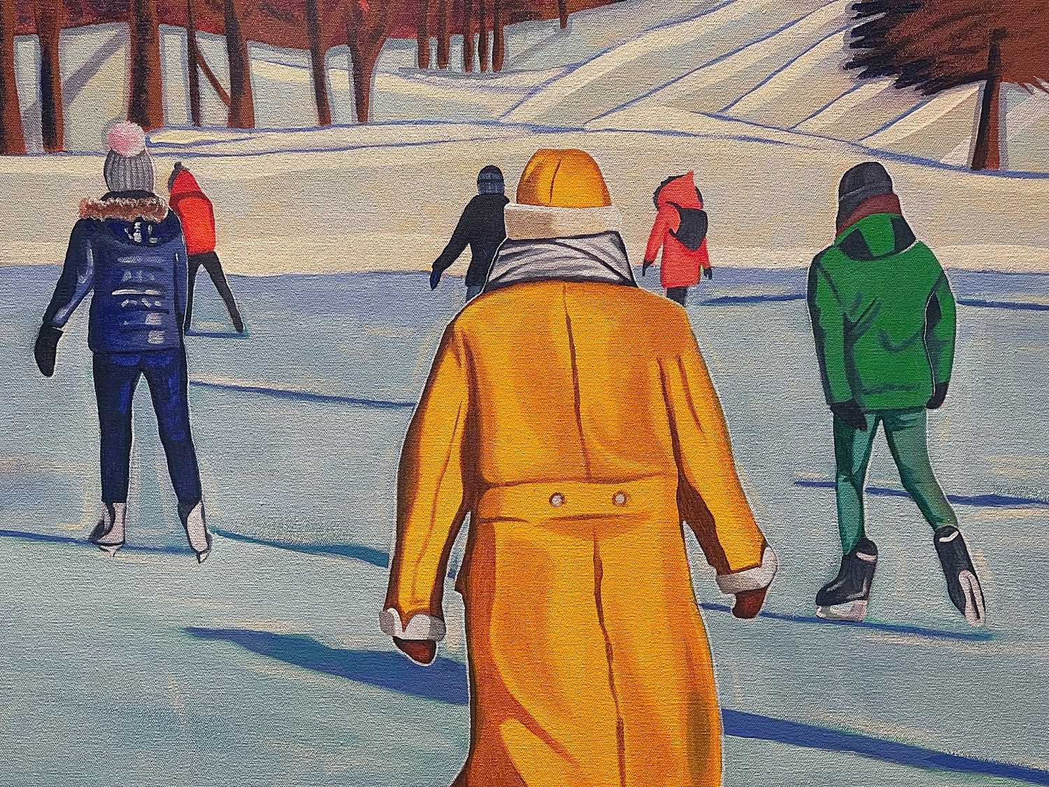 Painting skaters outdoors allows me to explore more than motion. It’s about atmosphere, breath in the air, the scrape of blades against ice, the muted soundscape that comes with snow-covered land. Skaters become small but essential figures within vast winter landscapes, reminding us of our scale in nature and our resilience within it. Often bundled in parkas, scarves, and knit hats, they carry a distinctly Canadian silhouette, recognizable even without faces.